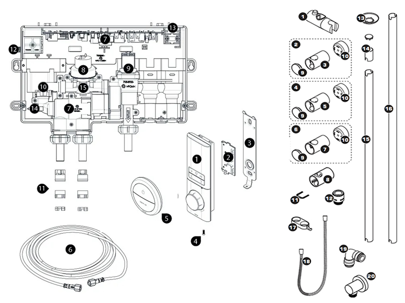 Use the main diagram to identify the shower spare(s) that need replacing. Then use the table below to locate the relevant part(s).